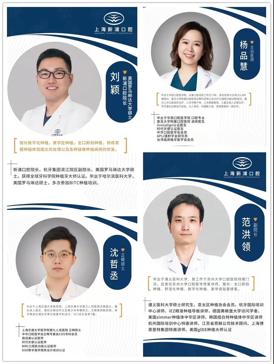 新浦优秀的硬件条件肉眼可见,而其“软件”条件同样强大——新浦医生团队来自同济大学、上海交通大学、第四军医大学等知名院校,集结了种植修复、美学矫正、儿童牙科、牙齿疾病诊疗等全方位全生命周期的口腔专家。