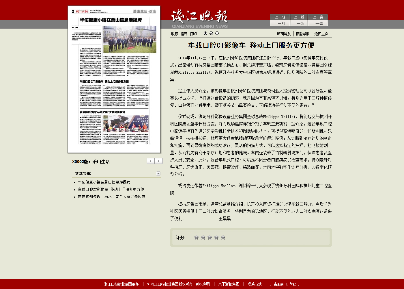2017年11月17日下午,在杭州牙科医院集团滨江总部举行了车载口腔CT影像车交付仪式。出席活动有杭牙集团董事长杨占友、副总经理董志强,锐珂牙科影像设备业务集团全球总裁Philippe Maillet、锐珂牙科业务大中华区销售总经理谢韬,以及医院的口腔专家等嘉宾。